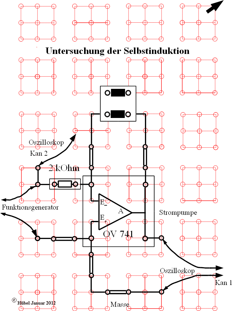 Auflageblatt für Leybold-Rastersteckplatte DINA4. Nicht eingezeichnet ist die Spannungsversorgung des OV 741 mit einer