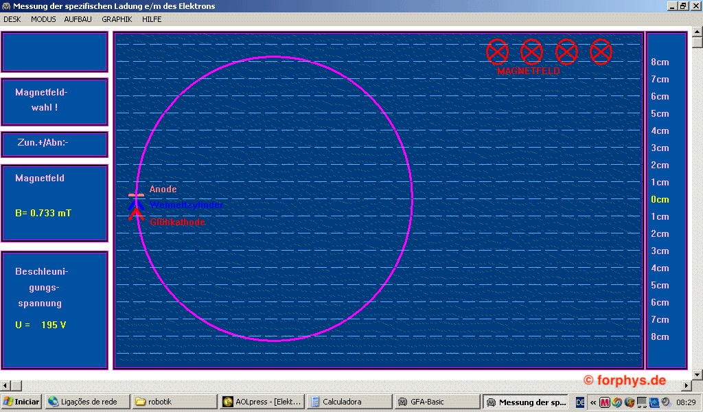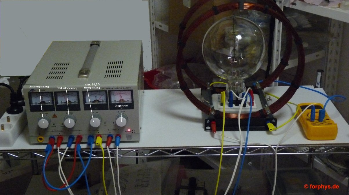 Du kannst dir auch ein Programm SPEZLAD.exe herunterladen, mit dem das Fadenstrahlrohr simuliert wird. Du kannst dann den Einfluss aller Parameter (U, B) auf den Kreisradius untersuchen.