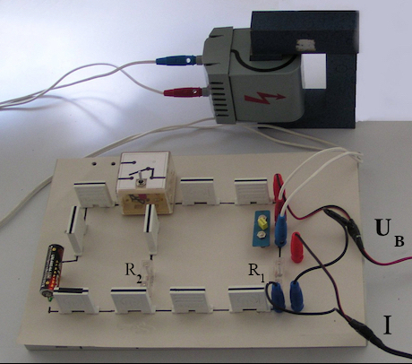Untersuchung von Ein-/Ausschaltvorgängen an der Spule Der vom Spulenstrom durchflossene Gesamtwiderstand Rges enthält auch den Innenwiderstand der Spule. Rges nennen wir auch R (Einschaltvorgang: R = Ri + R1). Nach Unterbrechung des Schalters (Ausschaltvorgang) fließt der Spulenstrom auch durch den Widerstand R2. Der durchflossene Gesamtwiderstand ist dann R' = R + R2. |