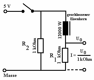 Nach dem Öffnen des Schalters muss dieser Strom weiterfließen, also entsteht eine Spitzenspannung Uind = - UL = I · R' = 1,7 mA · 4,0 kΩ = 6,7 V. Sie hat gleiches Vorzeichen wie UB, weil sie einen gleichgerichteten Strom durch die Spule fließen lassen muss. Sie muss größer als UB sein, weil der unveränderte Strom durch R1, den Innenwiderstand der Spule Ri und R2 gepumpt werden muss.