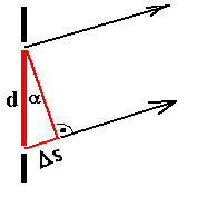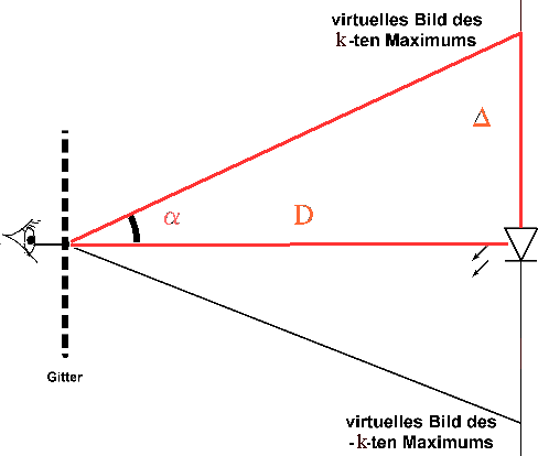 Hilfe des virtuellen Bilds auf dem Maßstab in der Nähe der LED. Unter dem "Ablenkungswinkels" α erscheint das virtuelle Bild des k-ten Maximums: tan(α) = Δ/D => α . Aus dem "Ablenkungswinkel" α und dem Gangunterschied Δs wird die Wellenlänge λ berechnet: sin(α) = Δs/d = k·λ/d mit k = 0,1,2,3 ... für ein Maximum k-ter Ordnung => λ |