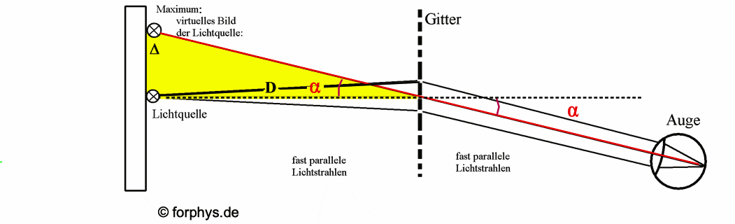 Abb. 1: Betrachtung einer schlitzförmigen Lichtquelle durch ein Beugungsgitter in großer Entfernung. Die rote Linie markiert die Lage des virtuellen Bilds der Lichtquelle auf dem Maßstab. Auf dem Maßstab in der Lichtquellen-Ebene kann die Ablenkung Δ abgelesen werden, die zum "Ablenkungswinkel" α und zur Wellenlänge λ führt ("subjektive Betrachtungweise"). |