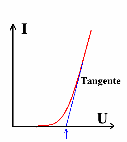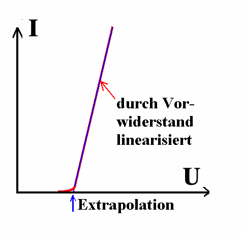 Geeignete Methode Als ich diese Methode 1982 vorschlug, hatte ich gleich empfohlen, die Kennlinie mit einem vorgeschalteten Widerstand zu linearisieren und vom "Hochstrom-Verhalten" auf I = 0 zu extrapolieren. Dadurch erhält man immer einen reproduzierbaren Wert, frei von Willkür, der als Knickspannung gewählt wird. Eine Theorie des p-n-Übergangs bestätigt das Verfahren und zeigt zugleich, wie in den Gesetzmäßigkeiten wirklich die Knickspannung sichtbar wird (sie erscheint nicht explizit in der Exponentialfunktion für kleine Ströme).