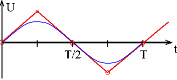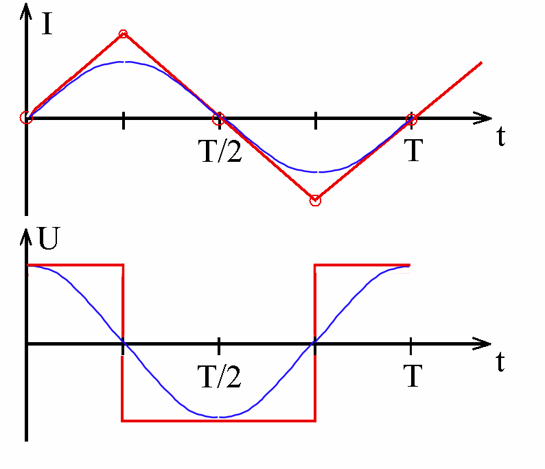 Abb. 2: Allein Kondensator im Wechselstromkreis Abschnittsweise konstanter Strom I sorgt für linear veränderliche Spannung U. links: dreiecksförmige Spannung, rechts: sinusförmige Spannung zeichnerisch ergänzt |
