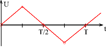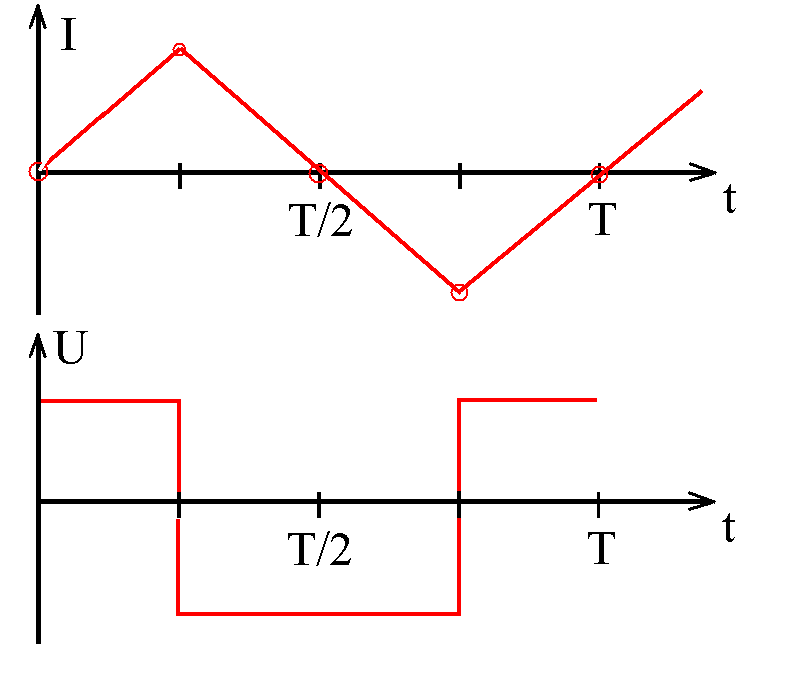 2.a) Wenn ein abschnittsweise konstanter Strom mit wechselndem Vorzeichen durch einen idealen Kondensator geschickt wird, entsteht an der Spule eine abschnittsweise linear wachsende oder fallende Spannung U entsprechend Abb. 1, weil es eine gewisse Zeit dauert, bis der konstante Strom den Kondensator geladen oder entladen hat, bis sich eine bestimmte Ladespannung auf- oder abgebaut hat.
