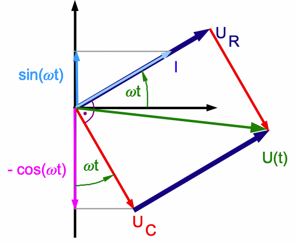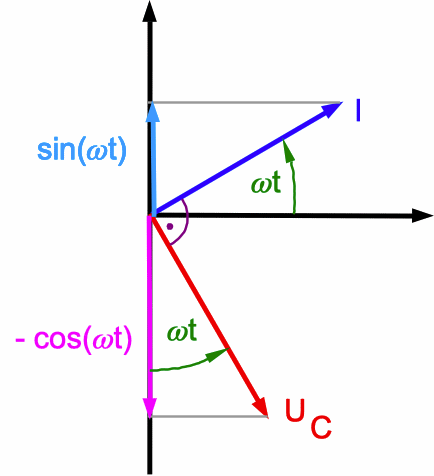Abb. 3: Das ist besonders einsichtig, wenn man die Rotation der Zeiger von I und UC im Gegenuhrzeigersinn betrachtet. Die von außen angelegte Spannung U(t) ist die vektorielle Summe von UR und UC: U(t) = UR + UC (Spannungsbilanz; hier UR = 0). Durch die vektorielle Summe werden die unterschiedlichen Zeitabhängigkeiten beider Spannungen berücksichtigt. |