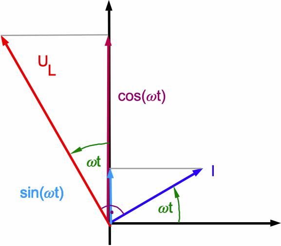 Abb. 5: Das ist besonders einsichtig, wenn man die Rotation der Zeiger von I und UL im Gegenuhrzeigersinn betrachtet. Die von außen angelegte Spannung U(t) ist die vektorielle Summe