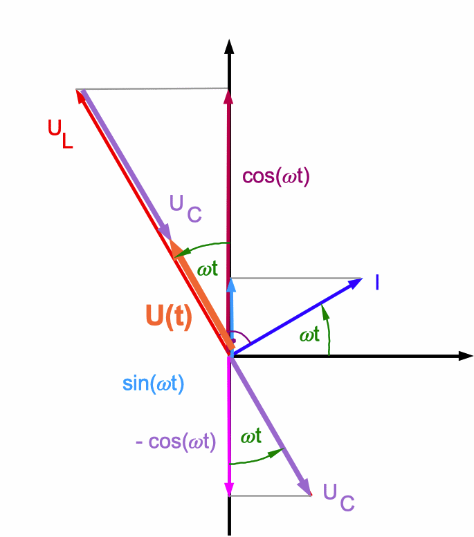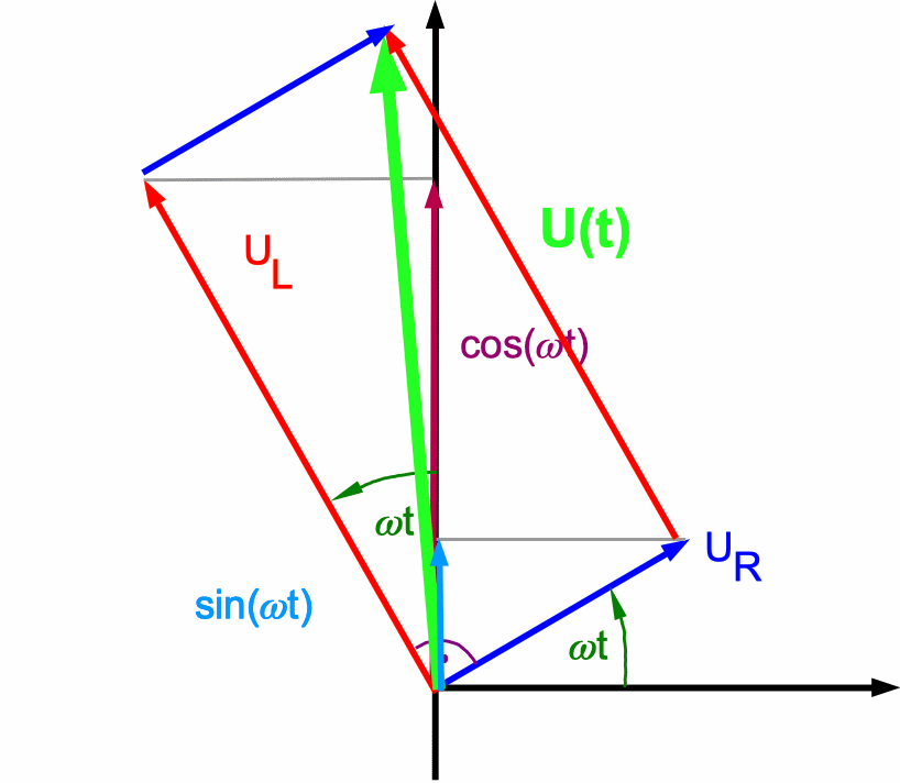 Spannungen wird durch rotierende Zeiger ausgedrückt. Dabei verändern sich sin(ω·t) und cos(ω·t) und die jeweiligen Komponenten in Richtung der vertikalen Achse. Die von außen angelegte Spannung U(t) ist nach der Spannungsbilanz (Gl. *) die vektorielle Summe der Teilspannungen. |