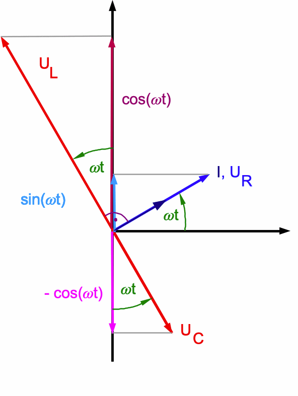 Wenn I prop. zu sin(ω·t), ist auch UR prop. zu sin(ω·t), ebenso wie dUC /dt. UC ist dann prop. zu - cos(ω·t) und UL prop. zu cos(ω·t).